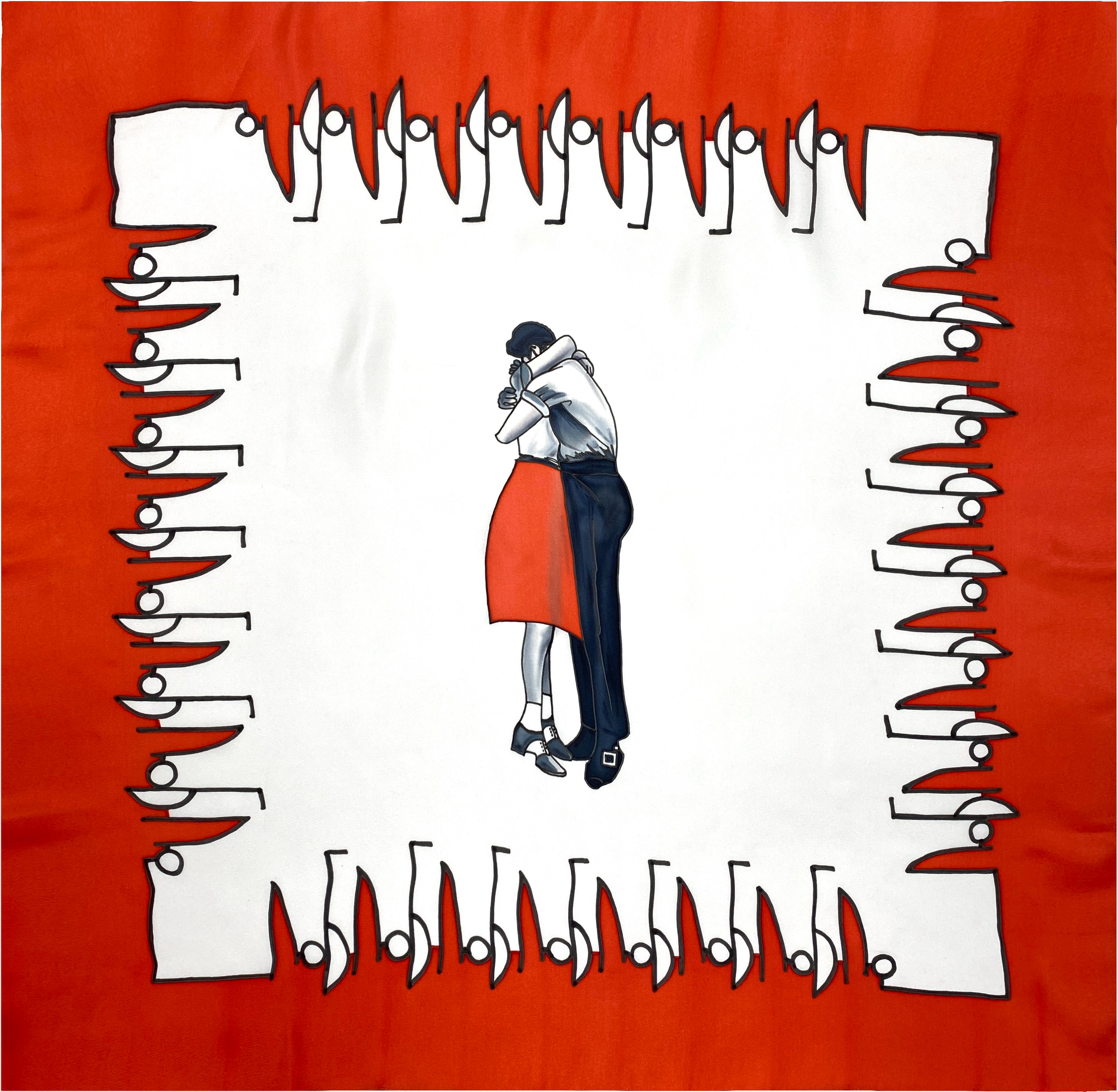 Рисунок платка вдохновлен романтическим подарком Маяковского Лиле Брик. В знак любви Лиля Брик и Маяковский обменялись кольцами. Каждый придумал особенную памятную гравировку на кольце. Лиля для Владимира придумала символ MW (заглавные буквы фамилии и имени на латыни). Маяковский же «закольцевал» на кольце Брик её инициалы — ЛЮБ. Они читались как бесконечное «люблю». До конца своей жизни муза Маяковского носила кольца на цепочке у себя на шее.
