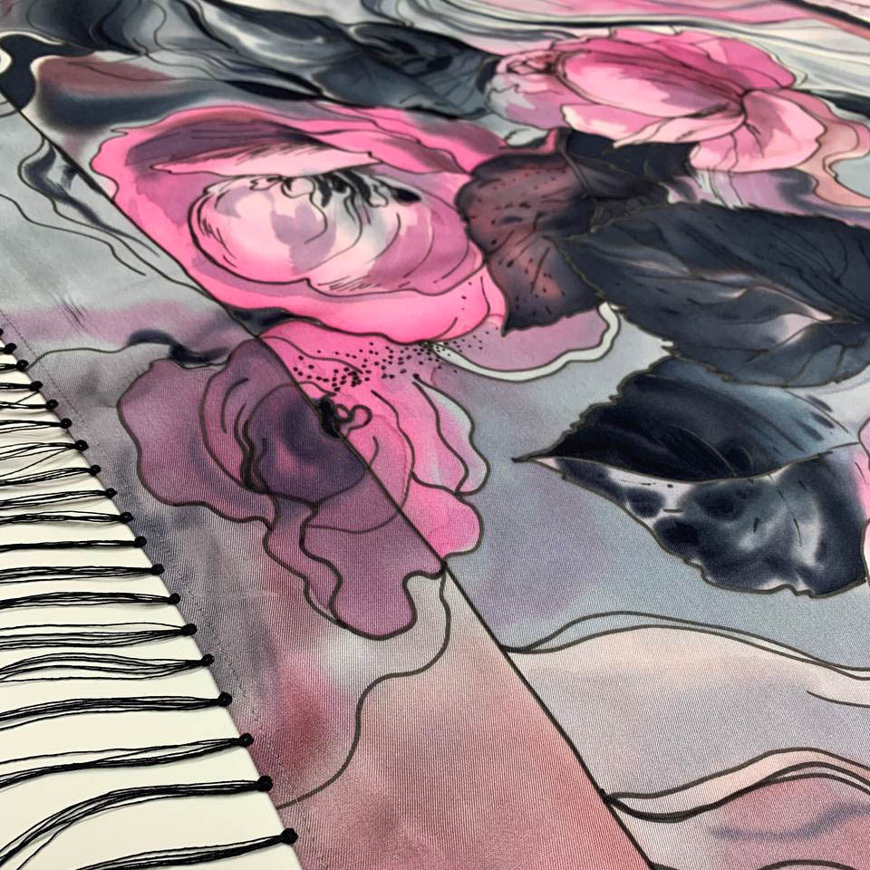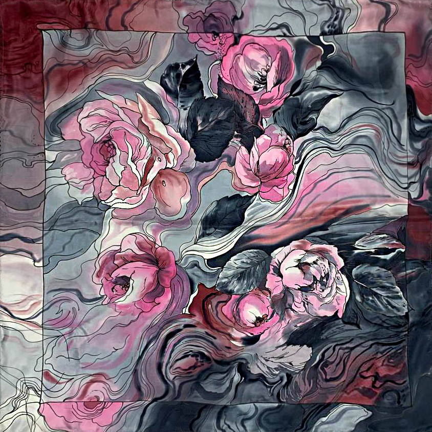 Шелковый платок ручной росписи батик "Розы с черными кистями"